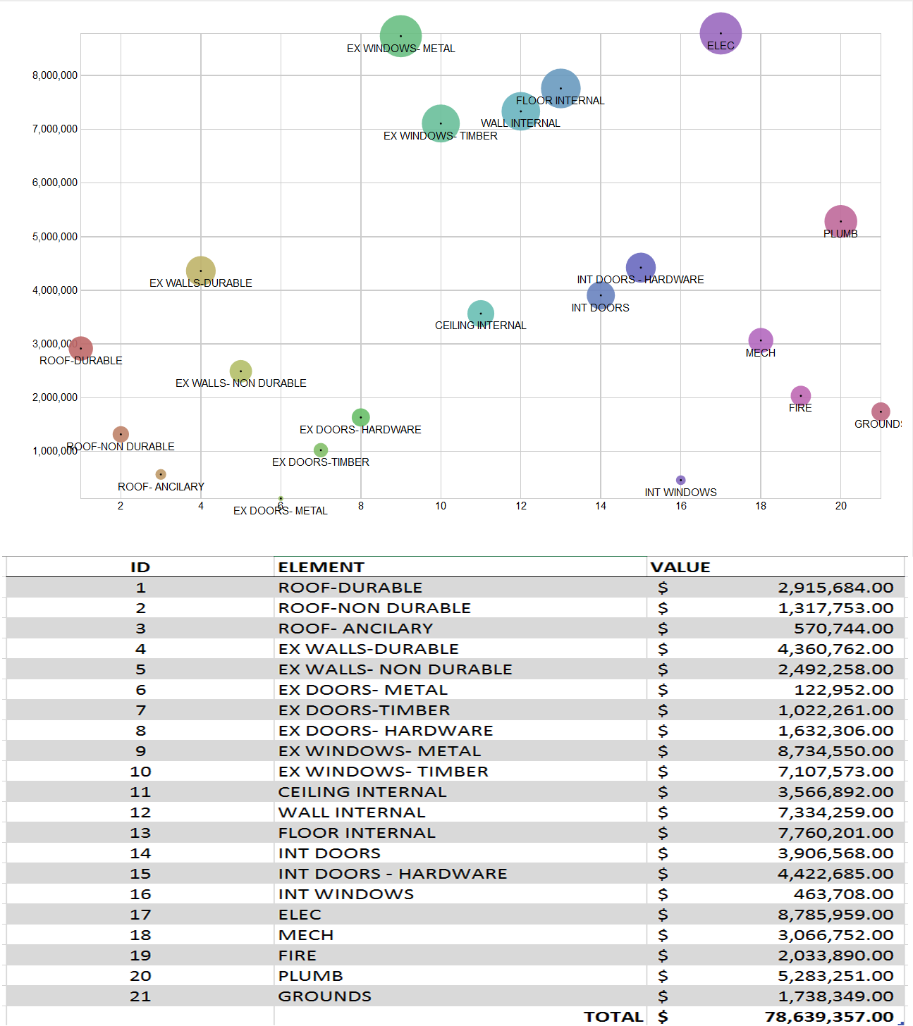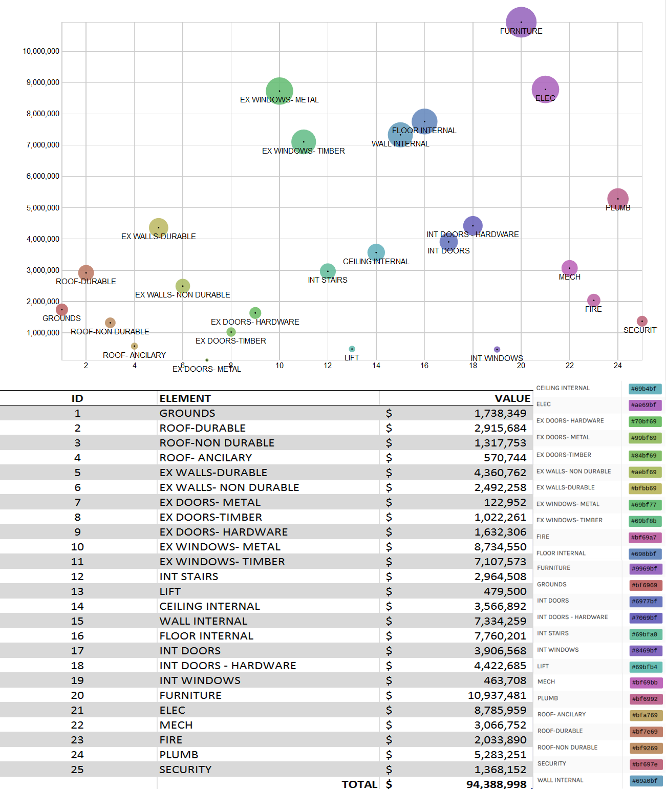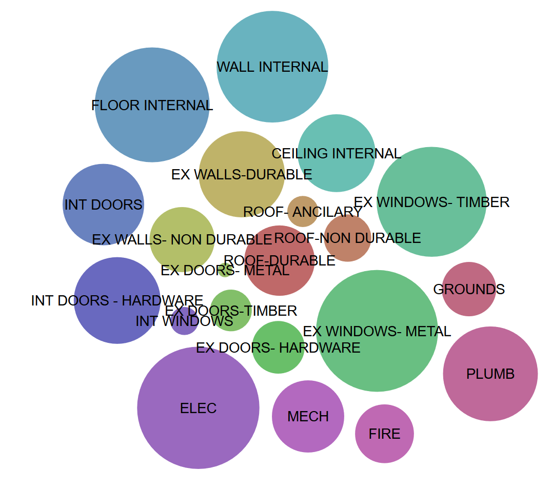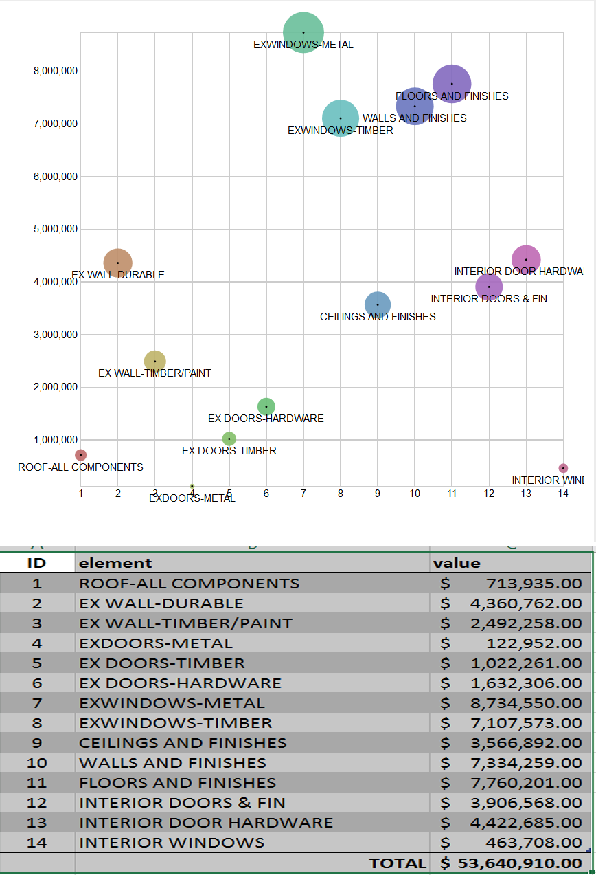 Roofs, which are an insignificant amount of the total sum at $714,000 or 1.3% of total sum, is an important item for Maintenance, as a failure in the roof could cause water damage that can affect the electrical system, internal ceiling, wall and floor fabrics and furniture, so making sure roofs are maintained should be prioritised.