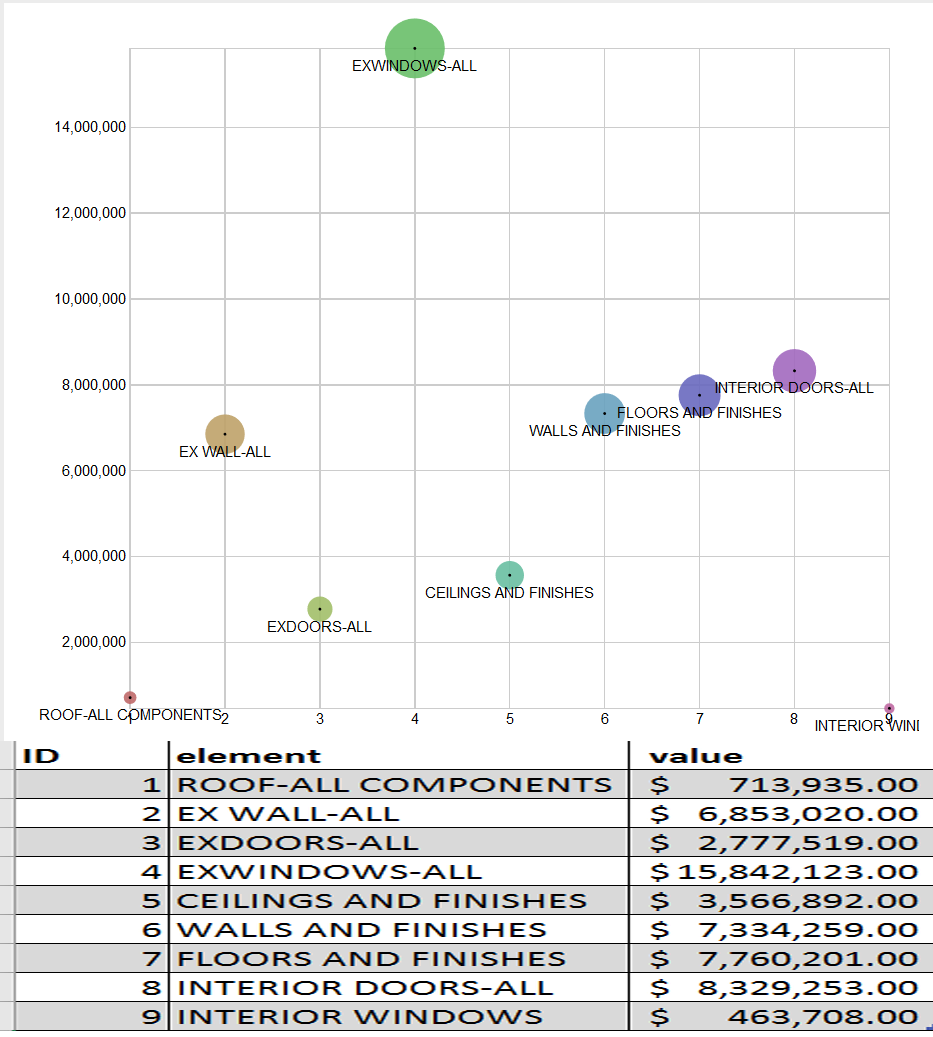 The intention was to show different types of graphs representing the same data to explore variety of expressions, but as the data was refined further the scatter plots seem to show clearly which elements have the higher value, and delving into the data shows which are high and low maintenance. Also labeling of data helped clarify the information.