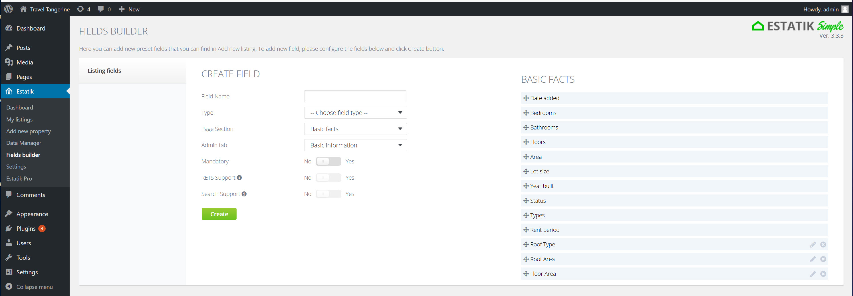 I first tried using the Estatik plugin. It looked quite promising as you could add your own fields, but when it came down to actually building the fields the setup page was about the Pro version rather than the free version and the relevant tabs could not be created. So the free version is a taster, of no realistic use for my needs. All the data would have to be on one page so it would end up being a long page of data.