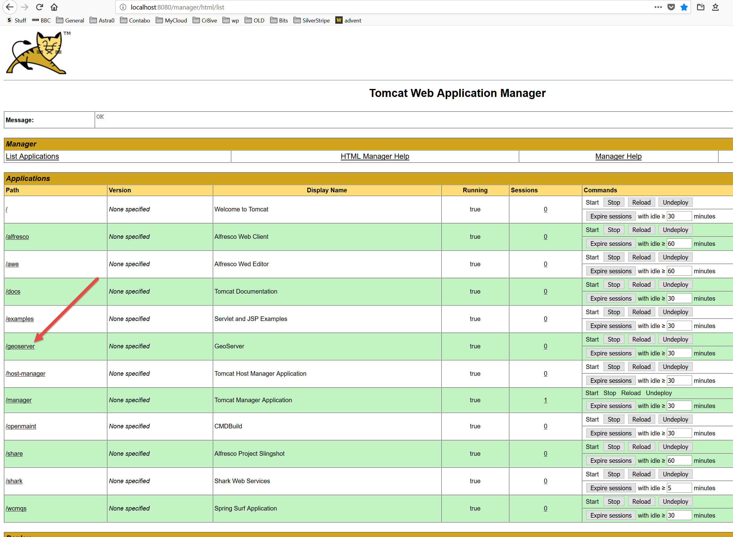So, start tomcat again and go to your browser localhost:8080 and when tomcat starts, go to Manager App and you will see the geoserver running.