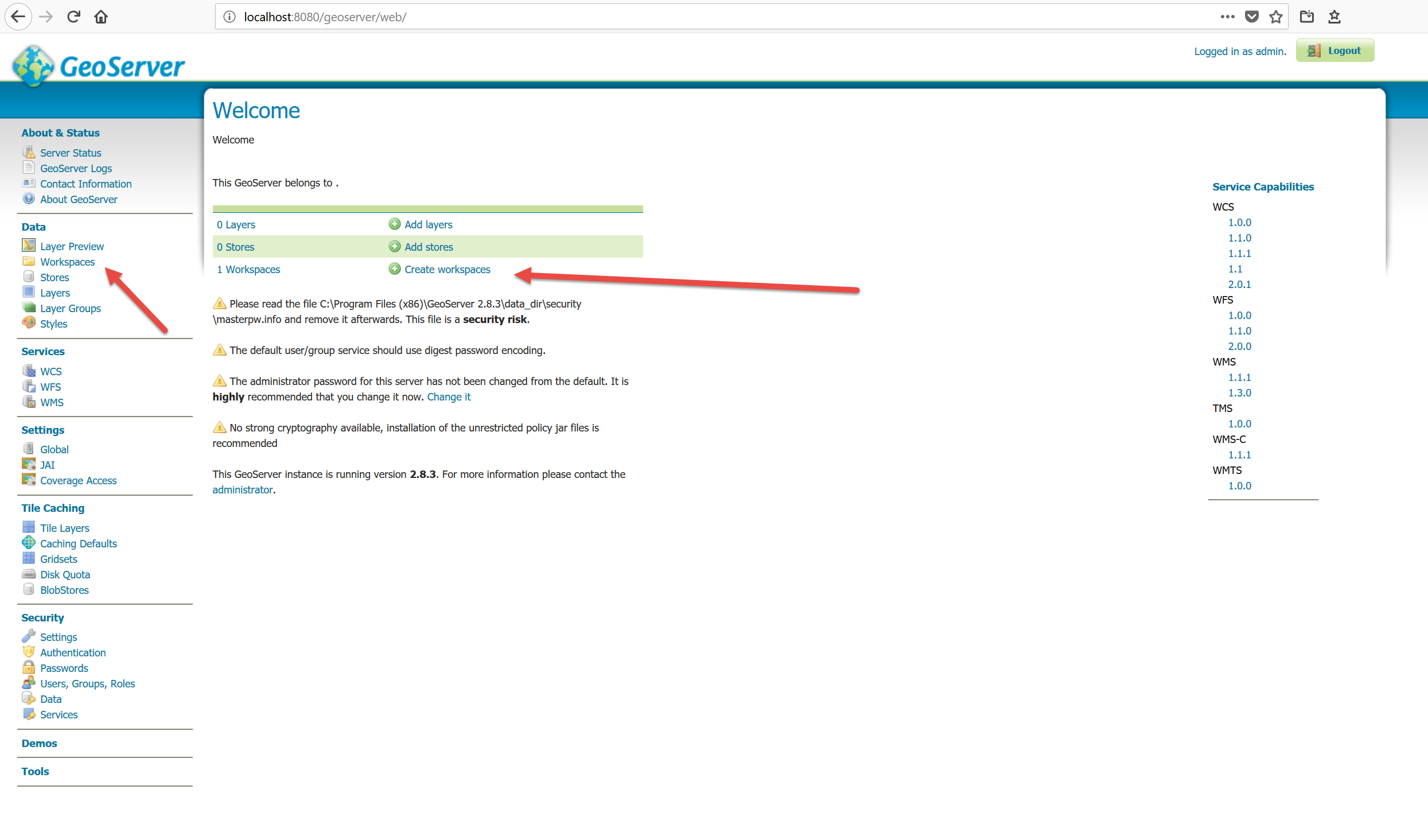 Click on the geoserver name on the left and it will take you to the geoserver page