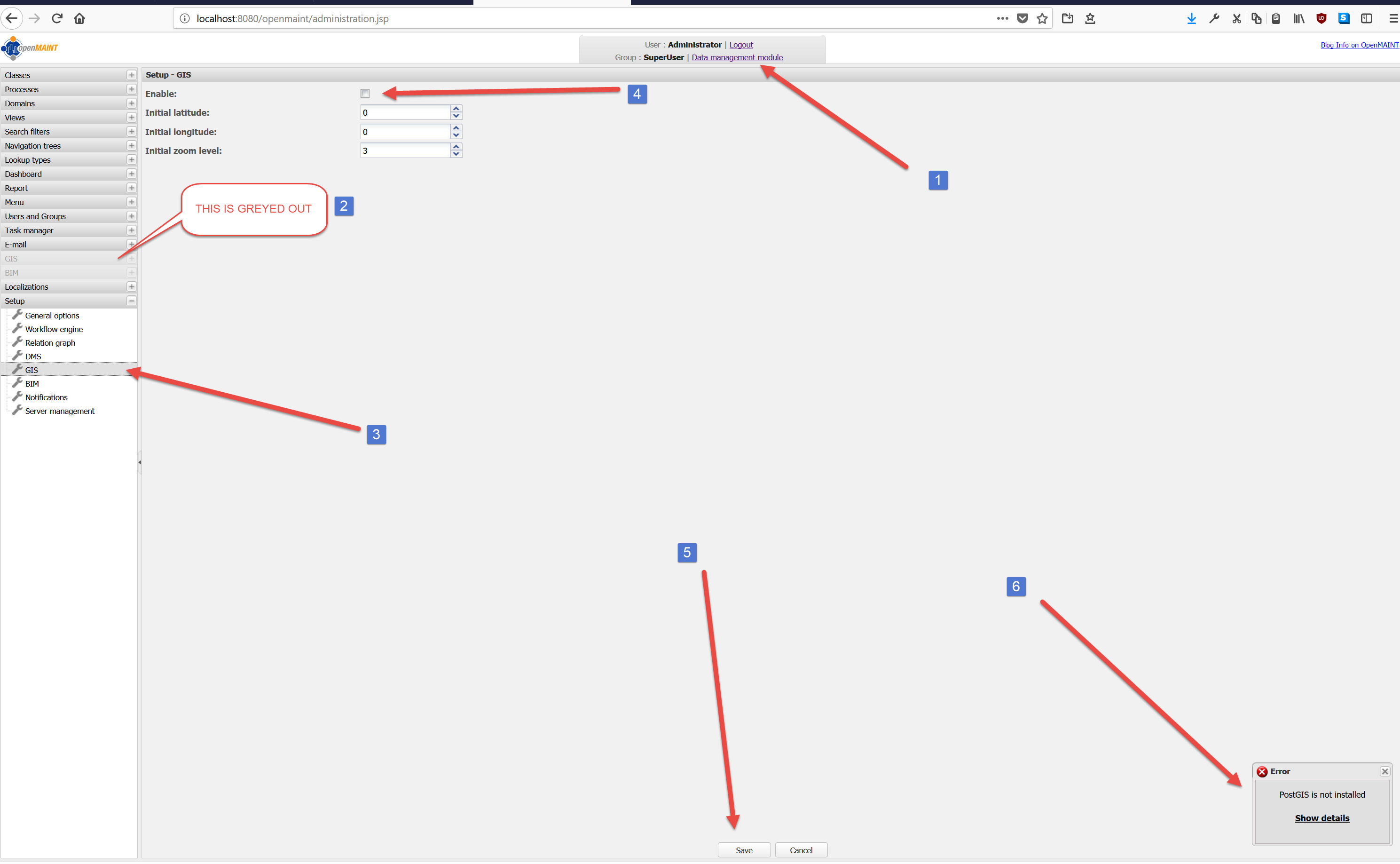 Now we have these items up and running, we should be able to get the openMAINT setup, so fire up openMAINT as your superadmin person and go into the Data Manager Module.