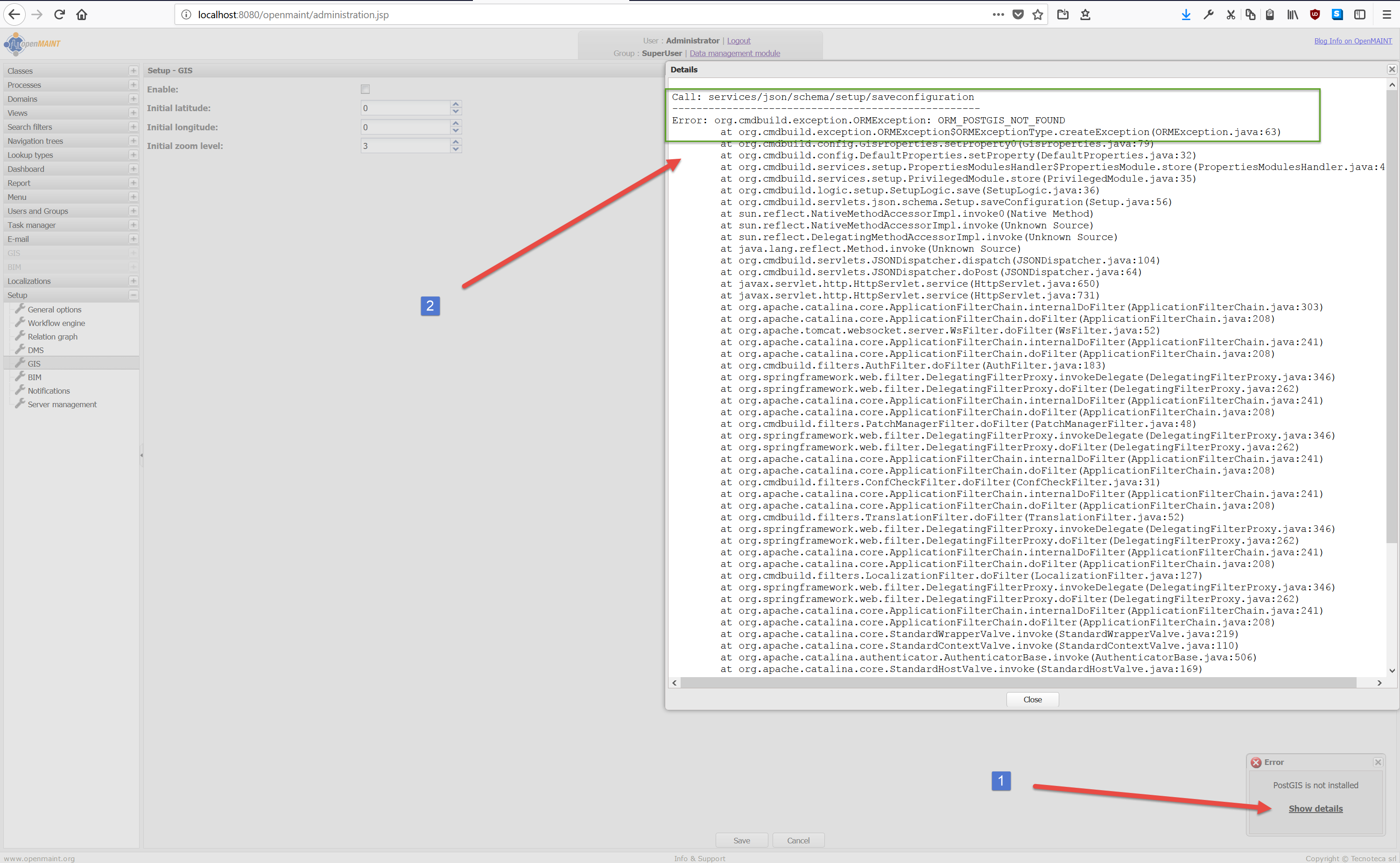 Error: org.cmdbuild.exception.ORMException: ORM_POSTGIS_NOT_FOUND