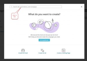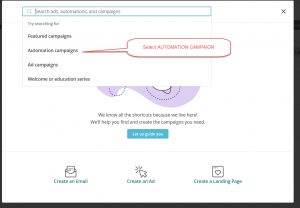 So on the CAMPAIGN tab you look to set-up a CAMPAIGN. I went around in circles trying to set up a regular campaign when what I wanted was an AUTOMATED CAMPAIGN, so I had to delete a few instances until I got what I wanted. It does not give you the AUTOMATED option in the menu below the page header CAMPAIGN, you have to use the search box, which, when you click on it, will drop down with other options.