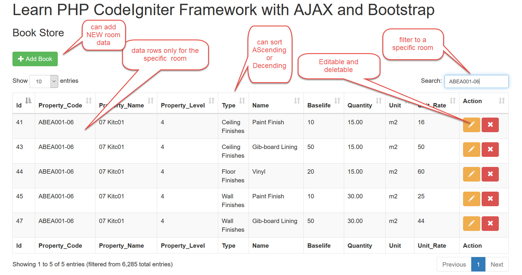 The other aspect I like is that the row settings (5,10,25 etc) are set at the beginning unlike the codeigniter(CI) example, so all the features are on display at the beginning, (rather than loading all the lines in CI and then showing the search button)