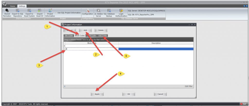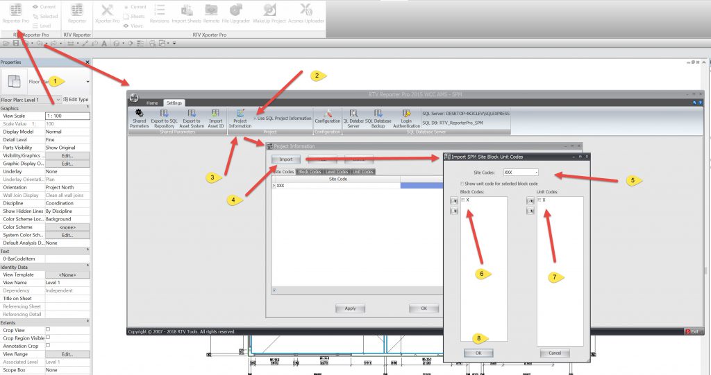 Select RTV Reporter Pro, go to SETTINGS tab, Click on USE SQL PROJECT INFORMATION, Then open Project Information, Select IMPORT BUTTON, Type in SITE CODE and tick appropriate BLOCK & UNIT CODES, Click OK button. When Pop U p IMPORT panel Closes, hit APPLY & OK in the Property Information Panel.