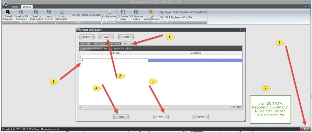 Then Exit from RTV Reporter Pro and SAVE in Revit. If you open up RTV Reporter Pro again and select a CATEGORY/CATEGORIES then you should , in the pull down menu for BLOCK & UNIT be able to choose the CREATED block & Unit codes. This should also allow you to EXPORT to SQL Repository for the particular Model File Name.