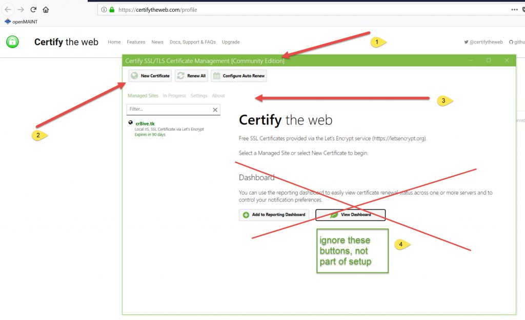 As I’m just testing, I only want the free account , so in the Community Edition (item 1) interface, you click on New Certificate Button in Top LeftHand corner (Item 2).
