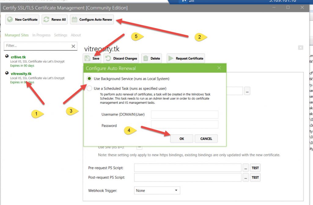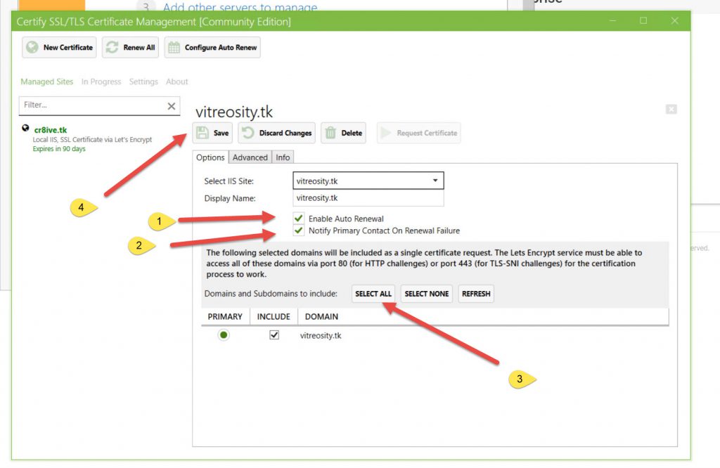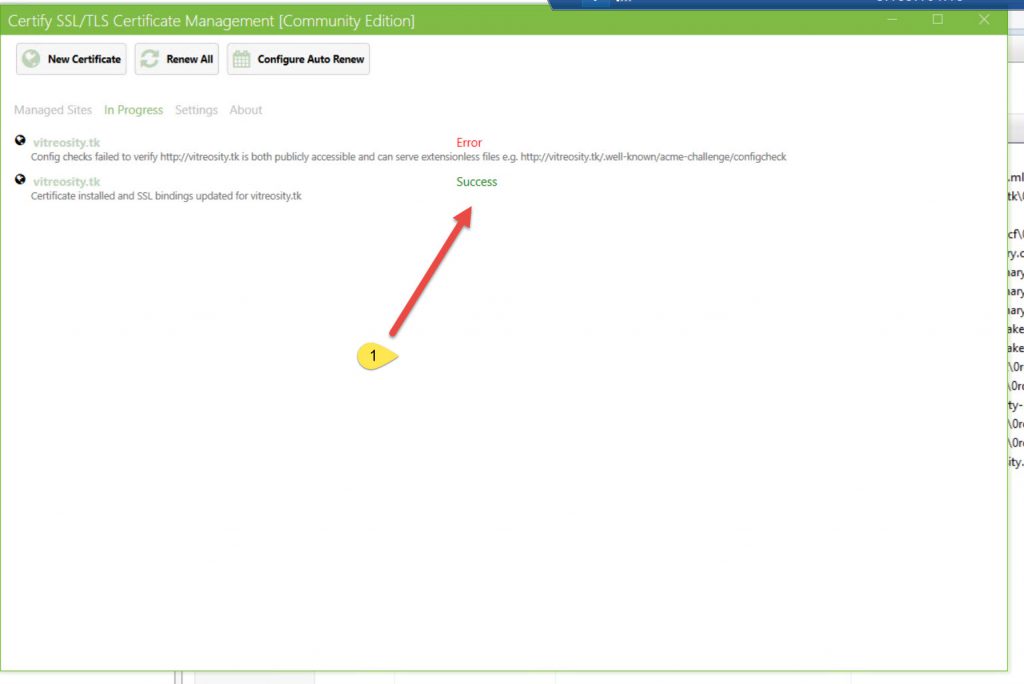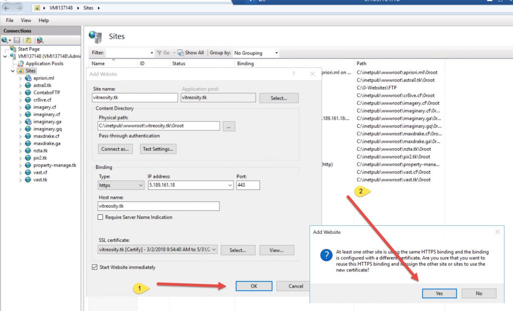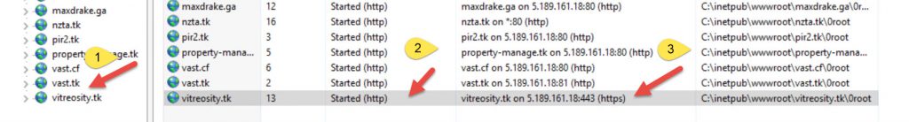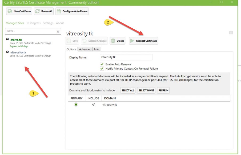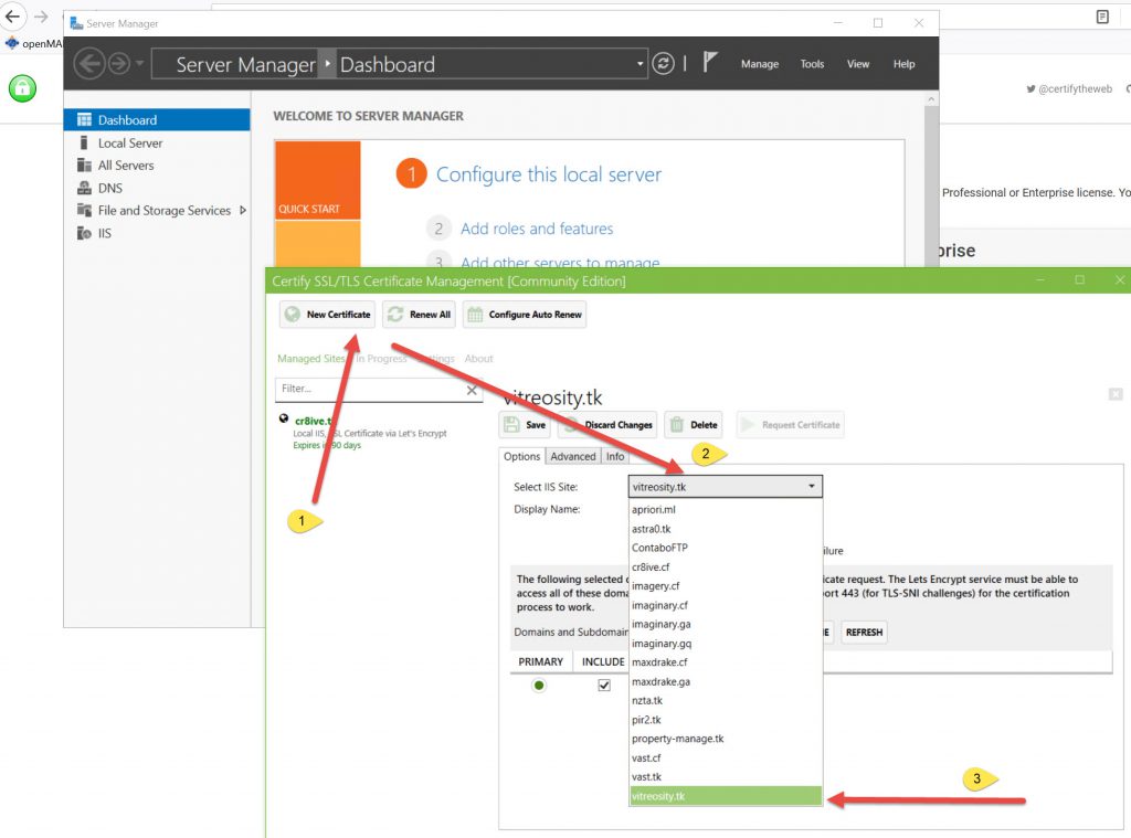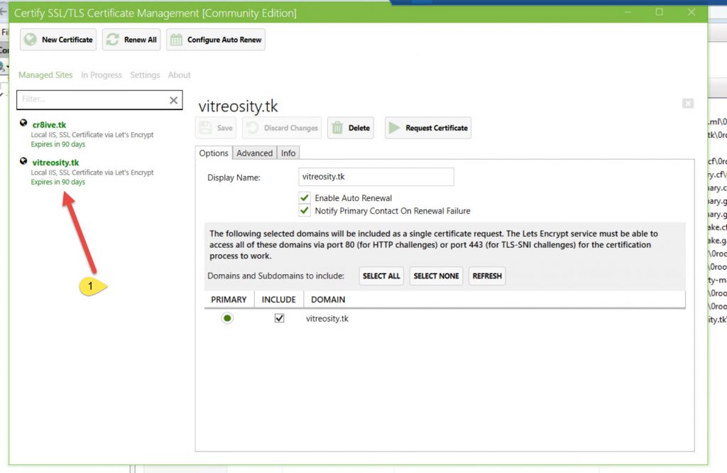Select Sites, Right Click and ADD NEW. Re-create vitreosity.tk as a HTTPS instance this time. From Certify SSL Manager, this has created SSL certificate.