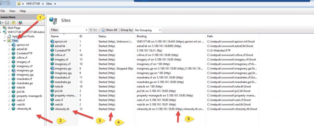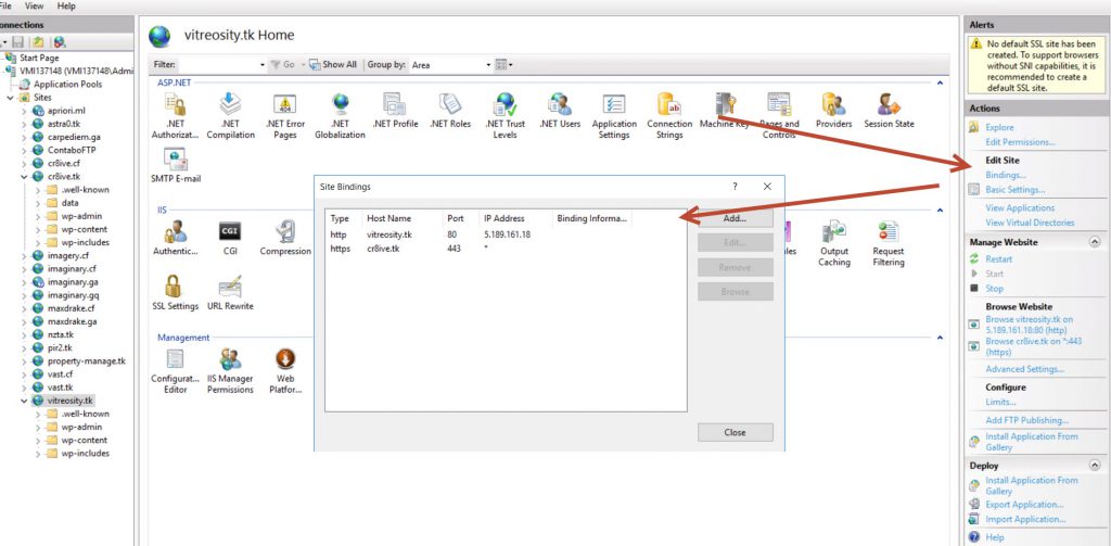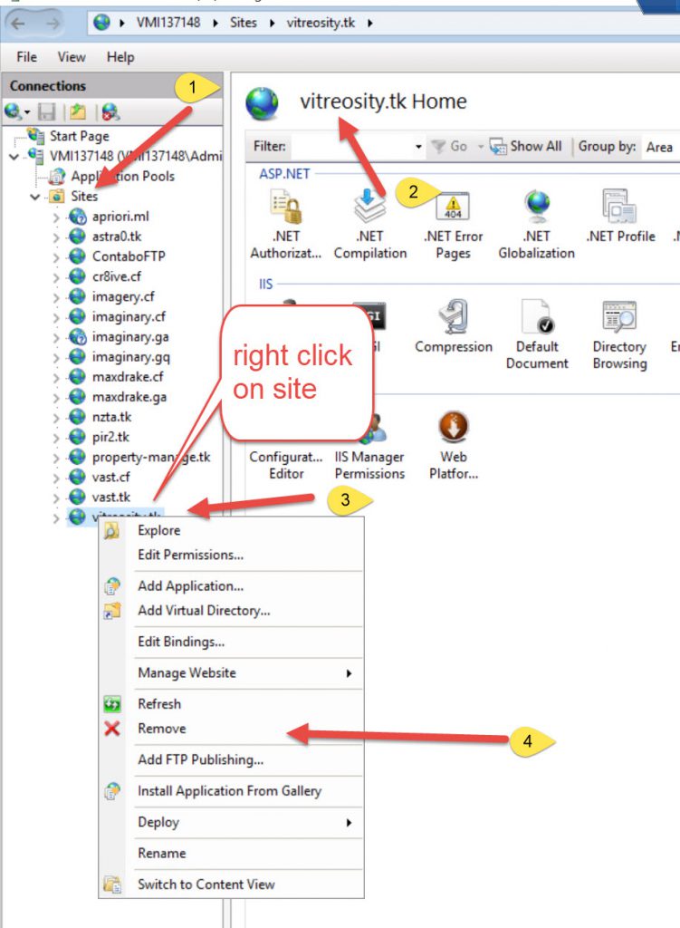 Open Sites, find the vitreosity.tk instance, right click on it and delete it. (This is setup as an HTTP instance, we want to change it to an HTTPS instance.
