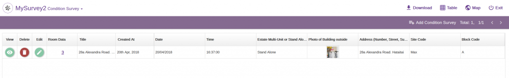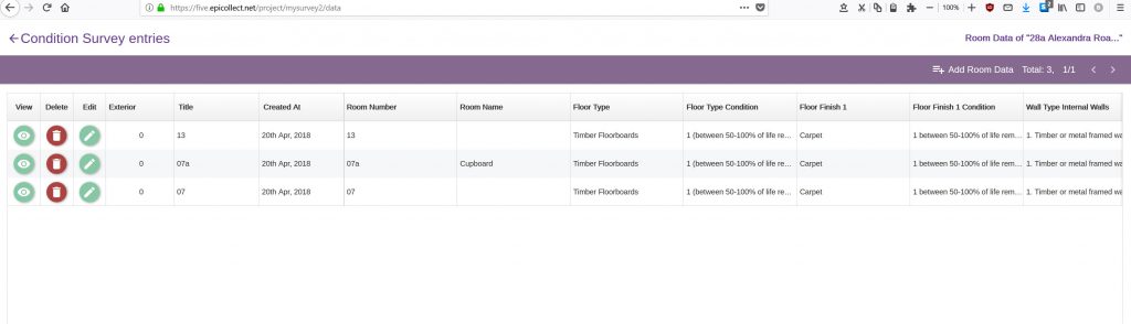 Here I only have one building with rooms (children data sets) off this parent Data. You can see that you can edit or delete this data, you can also download it or view it as a table or map. Hitting the Exit button takes you back to the overview of the project.