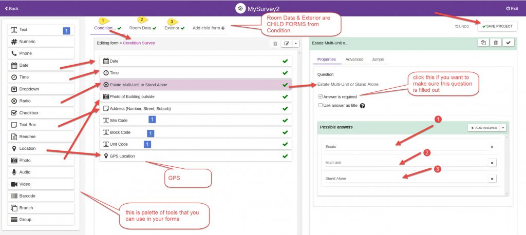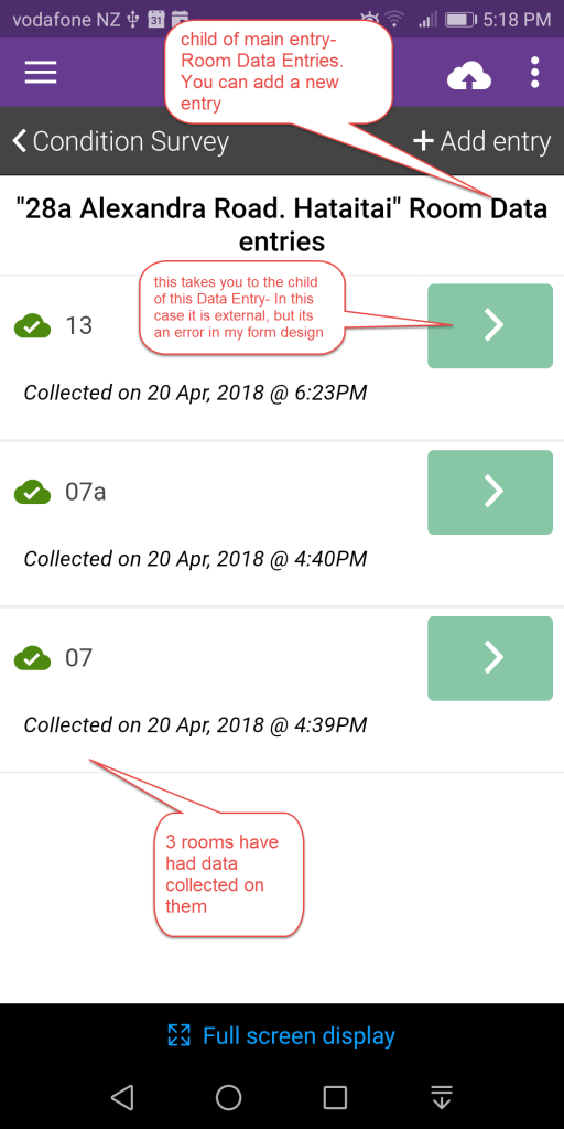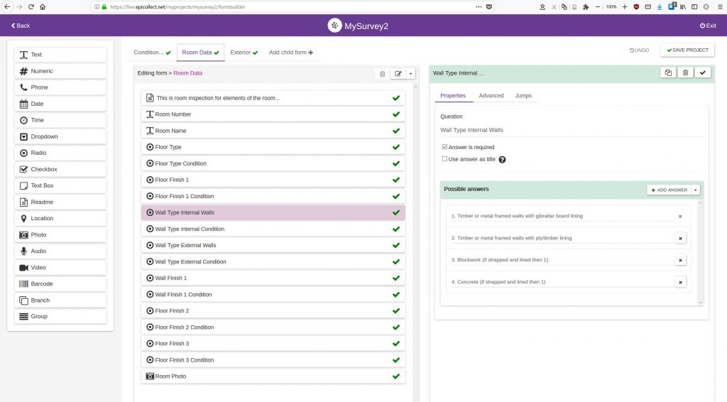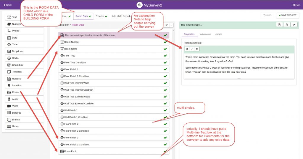 After gathering data about the building I wanted to go into the rooms within the building and gather specific data about each room. So I made the Room FORM a CHILD FORM of the building. I then stuffed it up and made Exterior FORM a child of Room, that should have been the other way around. I will have to redesign the form for that.
