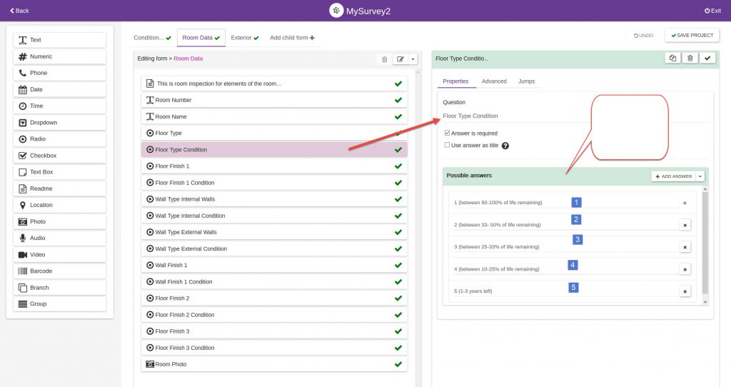Wall/Floor/Ceiling Finish and a condition and remaining life for each, you can put these in as individual groups. Which is good.