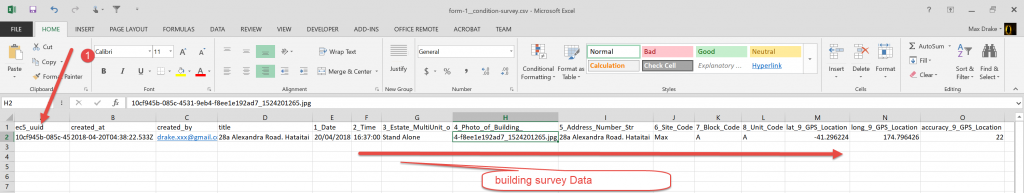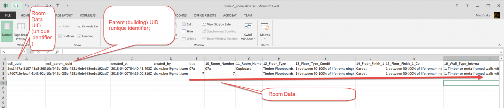 Now data comes out as a CSV file per form. So for this I ended with 2 CSV files, one for the Building Data & One for the Room Data.