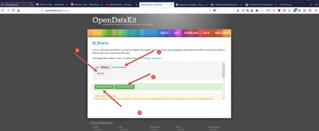 Using the XLSForm upload, select a file (1) and then Submit it (2). If there are errors it will tell you at the bottom (light tan/yellow area) you need to fix these before it will let you go any further.