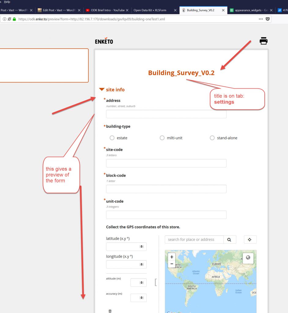 Once you see the green buttons, you can use the right hand button to Preview the Form in Enketo (which is really useful (see imge below) andf use the right green button to download the XForm file (with .xml extension)