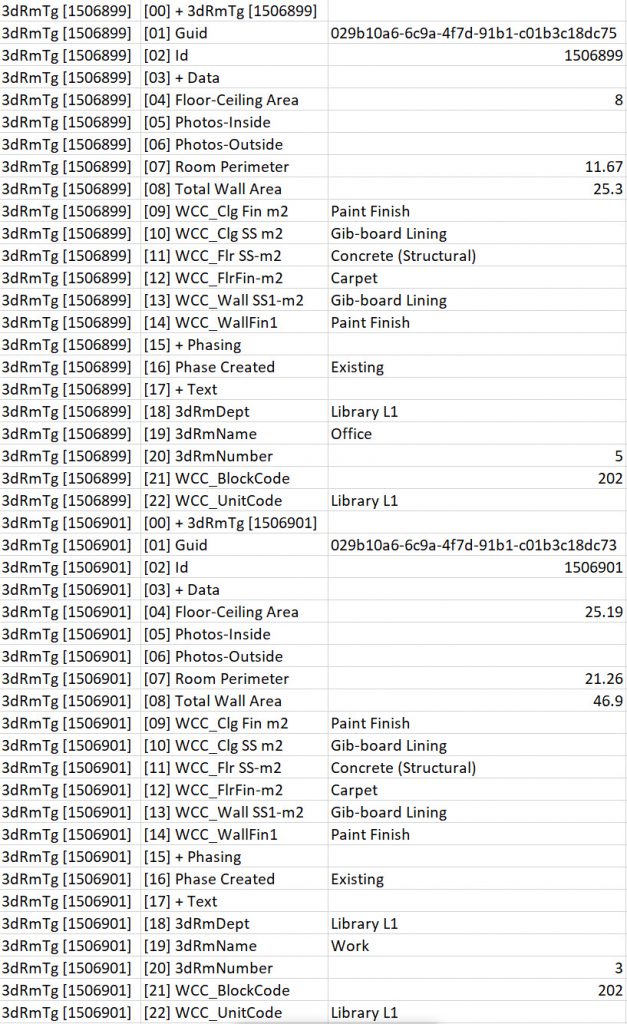 I have developed an Excel Macro that will take the CSV data from the 3D PDF and order it on separate sheets to show specific data in the building in an orderly fashion, such as Room, Door, Window, Seating(for Auditoriums/Theatres), Mechanical, Electrical, Plumbing & Fire etc. Specific information is displayed on separate worksheets or can be exported to separate files.