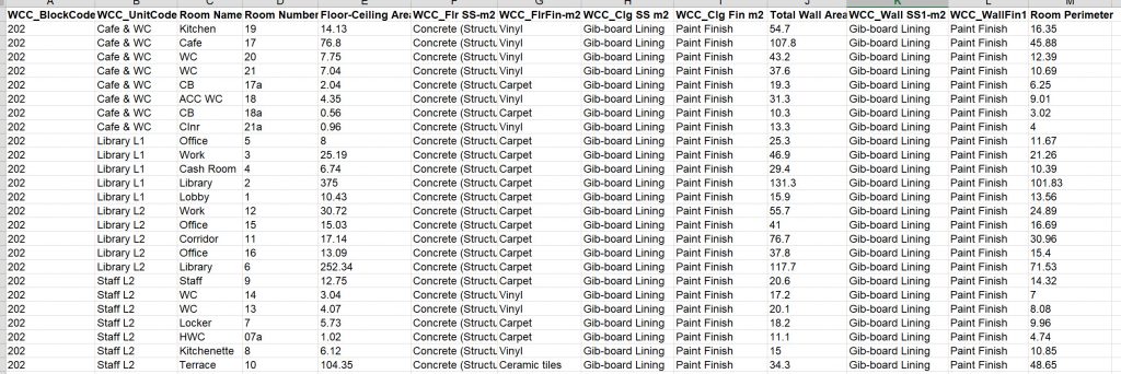 I wanted to test the versatility of Python by replication this process by creating an Executable file that will take a selected file and convert the data from a CSV to an ordered export CSV or XLS file. I decided I’d create a script for supplying a table for ROOM DATA (wall, floor, ceiling substrates & finishes and areas).