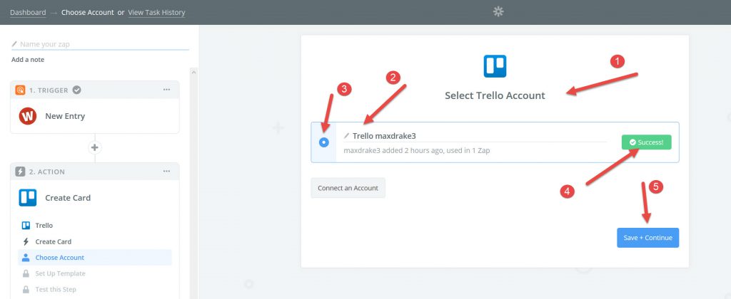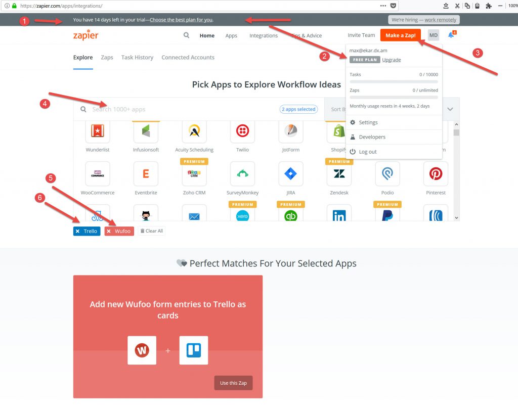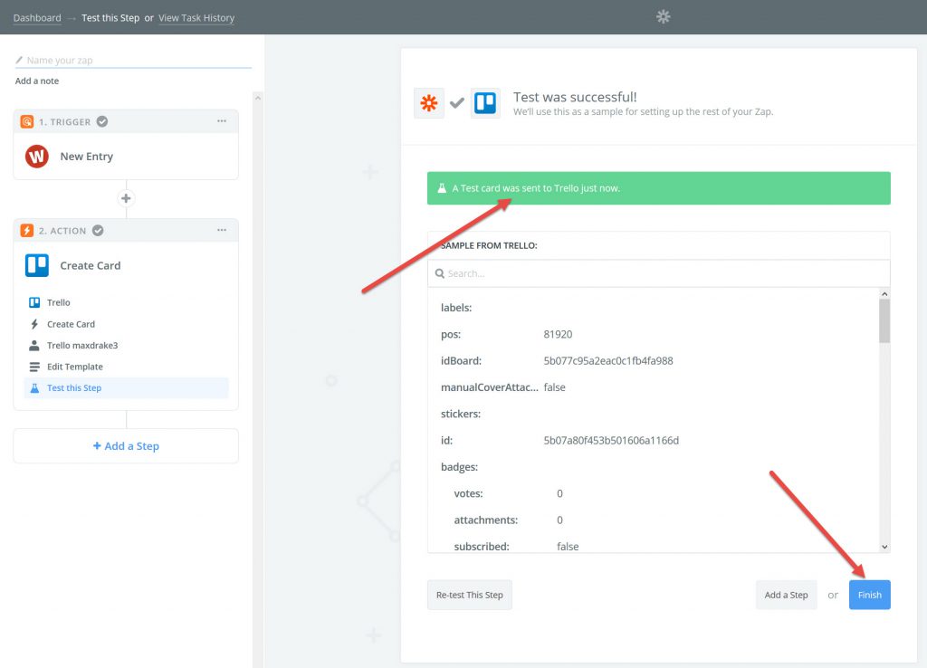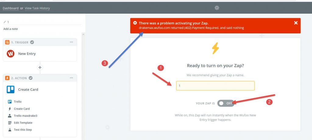 I then made a ZAP to connect Wufoo and Trello. The tests all worked. But when I tried to switch on my free ZAP I get told my free Wufoo account has exceeded its daily limit. The “Contact Me” forms do appear in the Trello account, so the process does work at least.