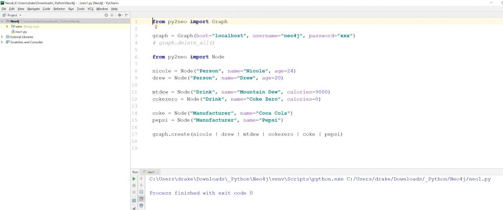 I had to alter the code in PyCharm to give Graph some connection details to Neo4j but apart from that the code ran great and created the nodes in Neo4j on my local server.