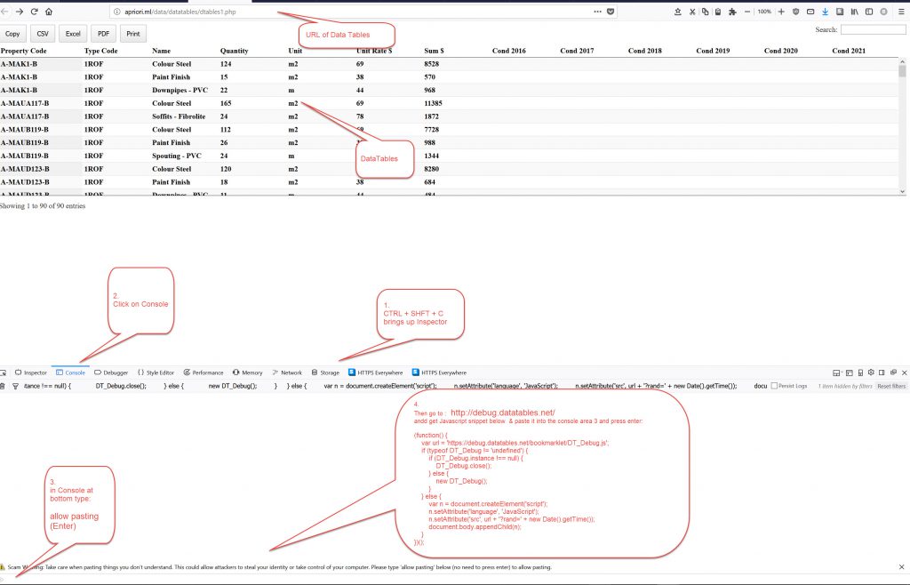 The dataTables calls jquery.js, and a few .css & .js files. I had the experience when working with the Panoramas where I was calling files from another web page via CDN codes (eg//cdn.datatables.net/1.10.16/css/jquery.dataTables.min.css) that I had left them live on my webpage and they were changed/updated and my webpages didn’t work anymore so now I create a sub-directory and put the minimised files in there to be referenced. That ensures that they will continue to operate even if there are updates.