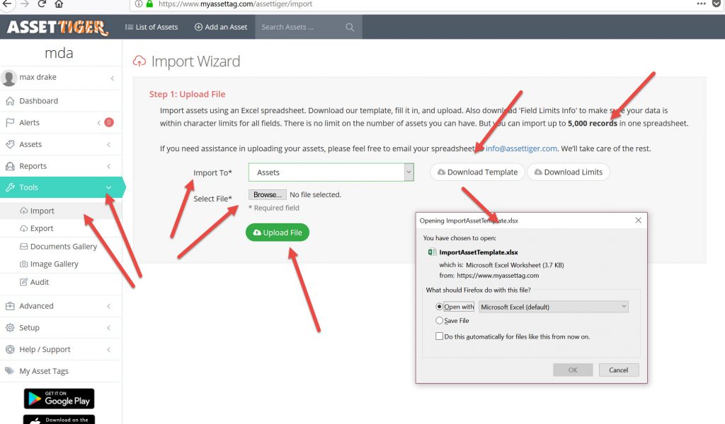 - Export Asset Template from Asset Tiger so that I could configure my Template for importing data.