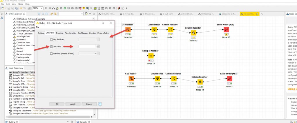 - Import the data from CSV. Also limit the size of the file so that I could choose 5000 rows of data at a time (in fact initially I chose 2 rows to test importing into Asset Tiger (to debug)