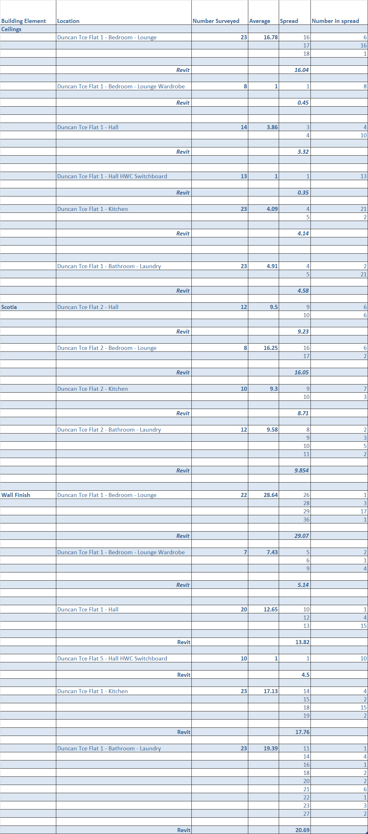 - The Revit models quantities were consistent, whereas there was variability in the surveyors information, even at the level of basic shapes of rooms with only simple elements (one door & one window) the variance was noticeable, although, when grouped together they averaged out to within a reasonable degree to the Revit quantity (Just hope the extremes are not used in quoting for work).
