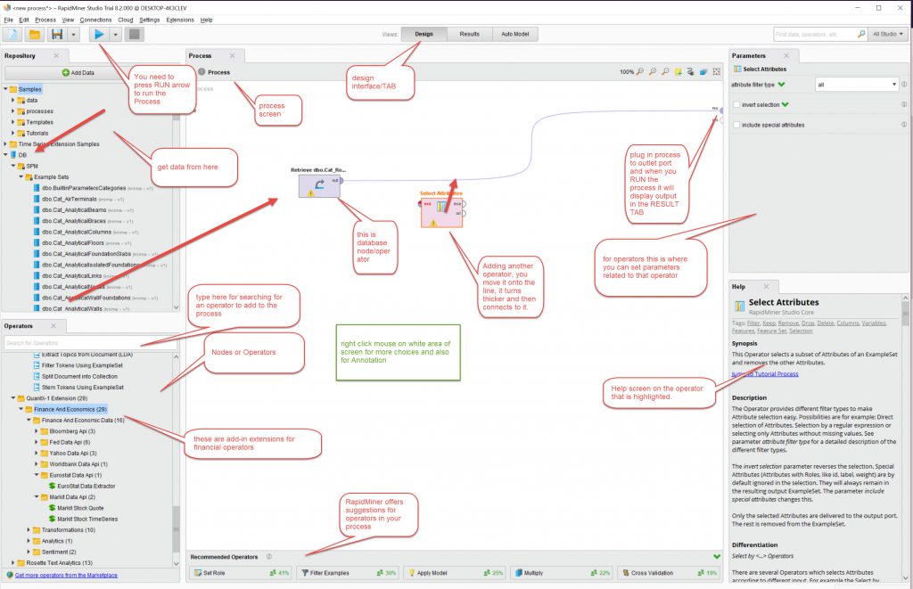 In the DESIGN area you connect to your DATA (Left Top Side Panel) and then have OPERATORS (Left Bottom Panel or Bottom Middle Bar) that do actions on that DATA.