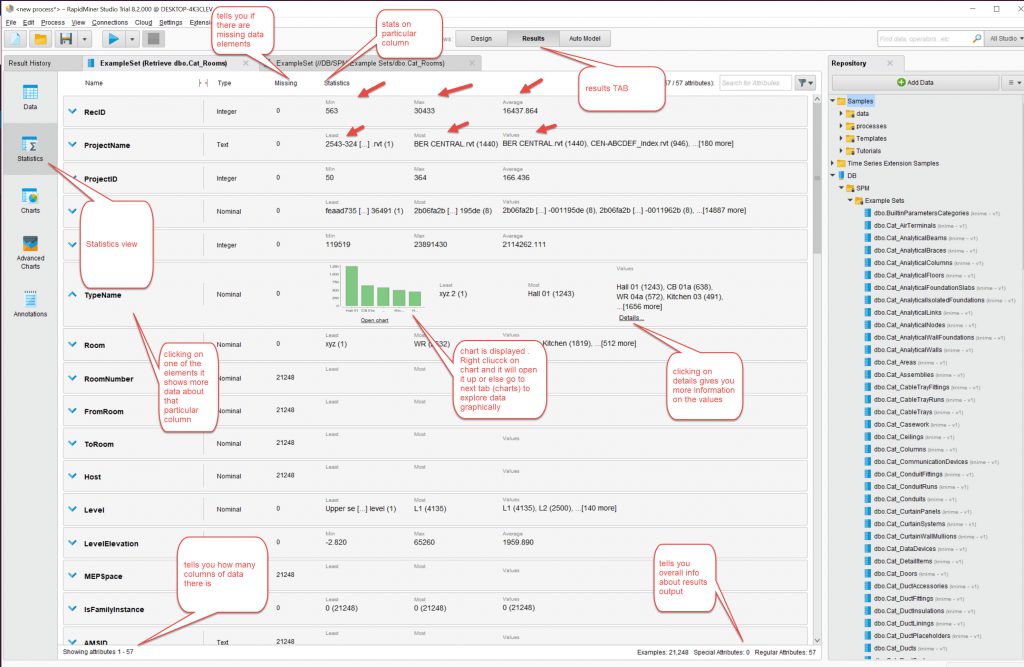 In the Statistics tab it shows you information about your data, whether you have missing data and the ranges /values of the data. You can click on a particular column of data (showsn as a Row) and see more in-depth information on that particular aspect of the output. A good way to explore your data and output. You can use this interface on your original dataset to do some tidying if you have say Duplicates, or poorly named information in a particular column, so its useful for data cleaning and preparation.