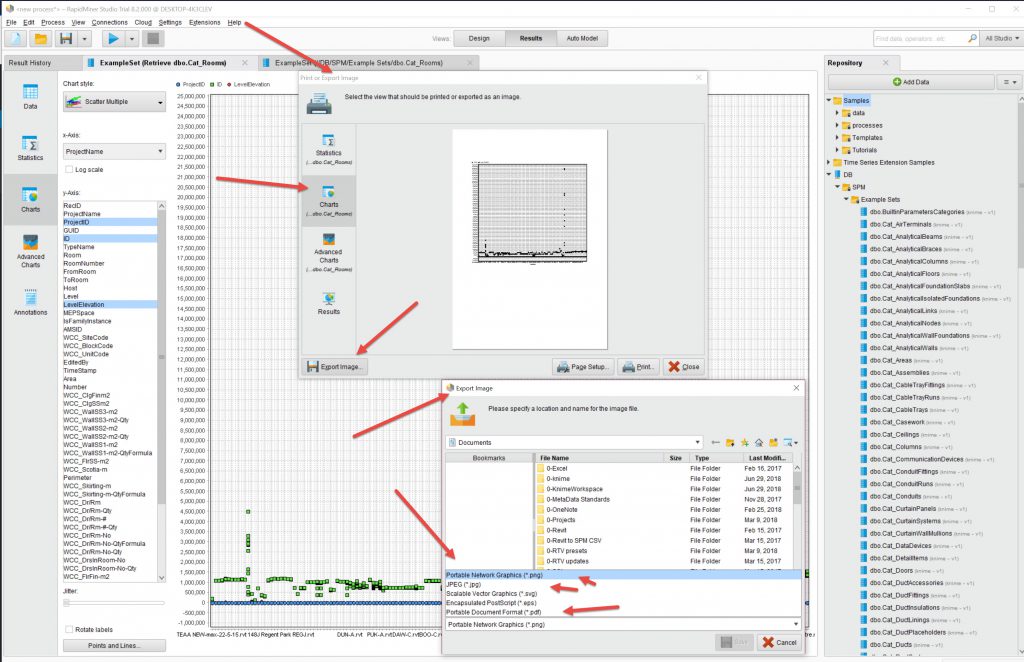 In the Print/Export pop-up choose output destination and type. For graphs you can export to PNG, JPEG, SVG & PDF.