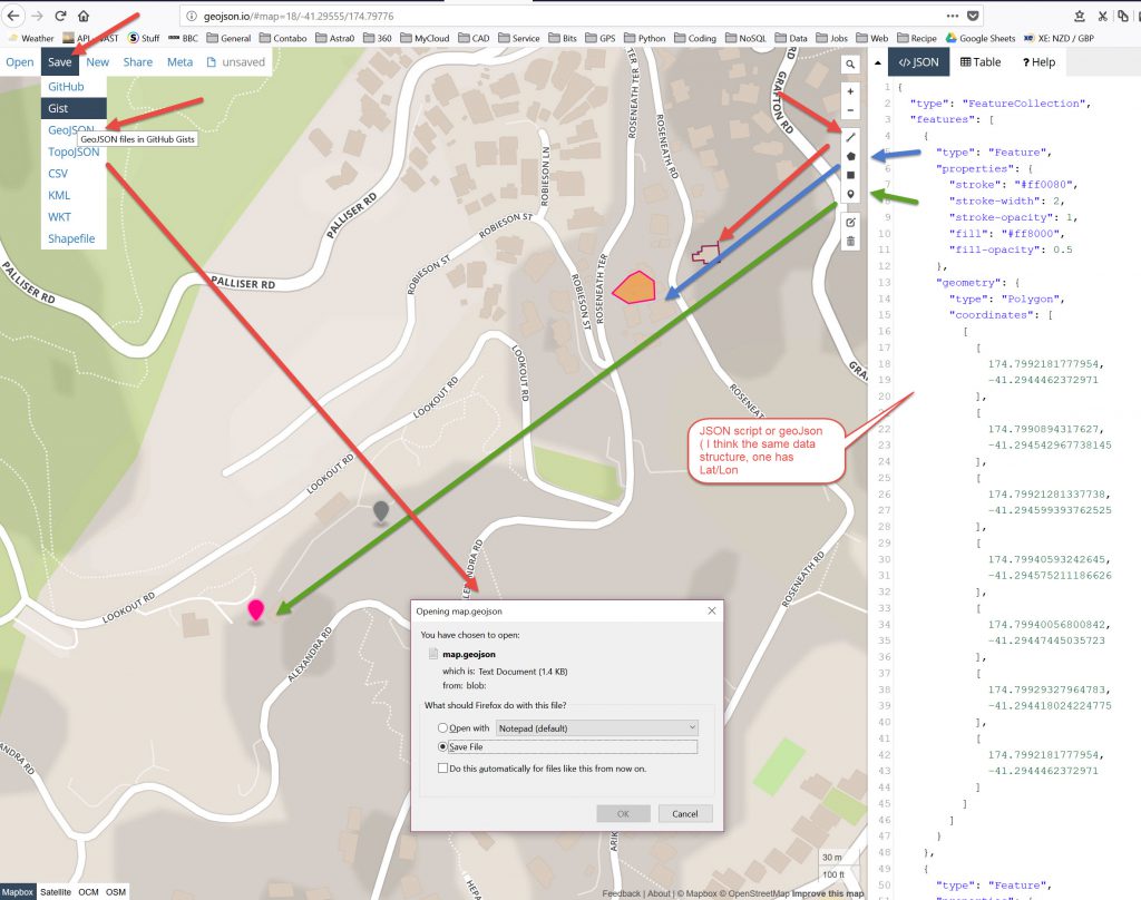 I’d come across this website and thought it was quite interesting. You could put polylines, lines and markers on the map and get the output in geoJson format. So this could be read with a bit of coding and displayed on a map on a website.