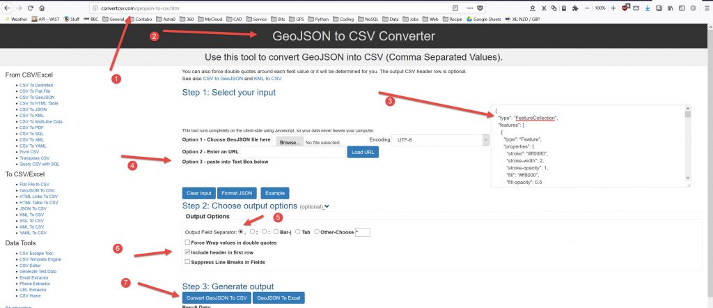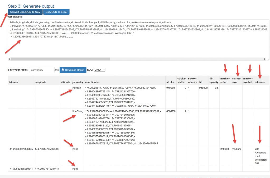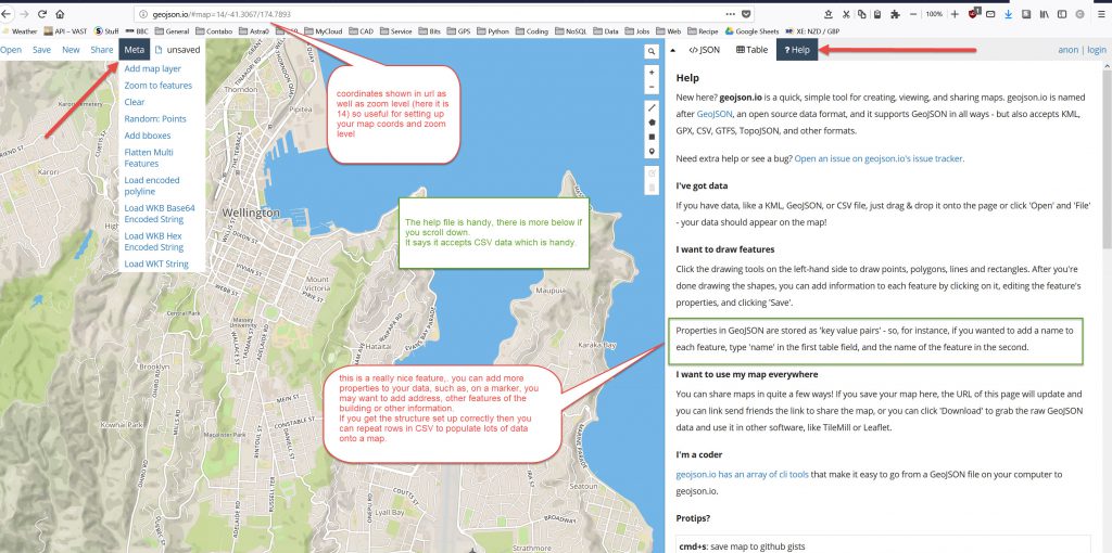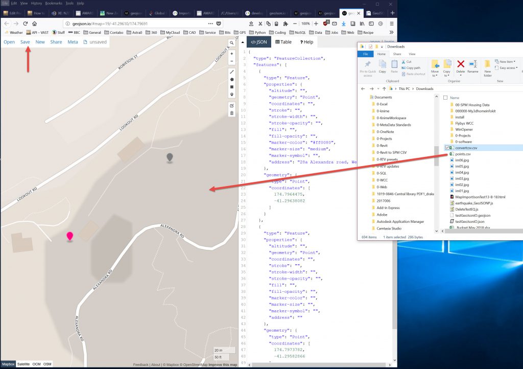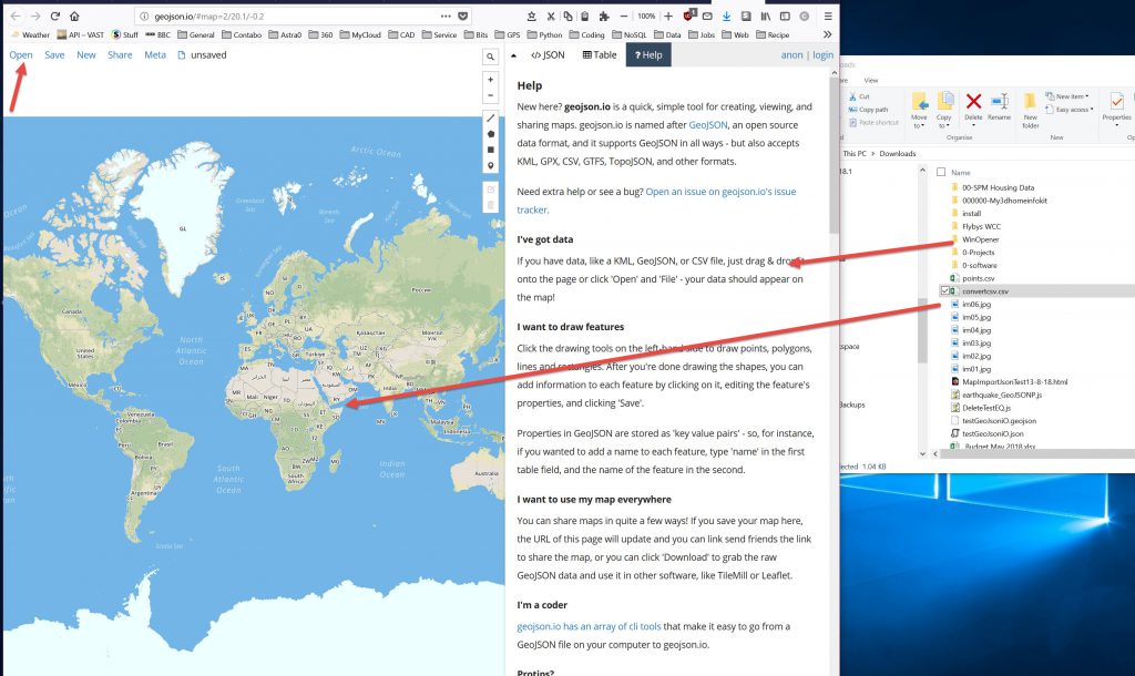 Using Open> File > xxx.csv and bringing in the file it doesn’t brings anything in with the data that I have converted using the online convert method. This is because the CSV interchange in geojson.io only works with points. So markers are fine. Also if you go Save> CSV it will only save the points (Markers).