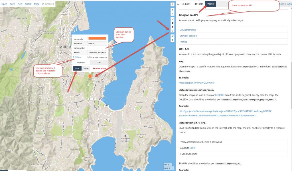 This website lets you draw lines and poly-lines and drop markers onto maps and quickly get the json file. You can always add different marker icons, more data and different colours to your information once you have all the coordinates. Then using CSV or Excel or Sheets to do all the formatting or to push in extra data. This can then be pushed into a Database Table for exercises like the changing size, colour and symbols for condition over time on maps.