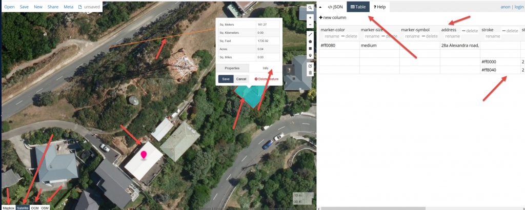 On the Markers, Lines, Polylines & Rectangles you can add extra Properties by “ADD ROW box at the bottom, to add more Data about a feature. This is good. You can then save to a CSV and then add all these new properties to all the other MARKERS (only) and bring thenm back into geojson.io .