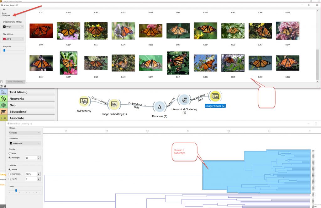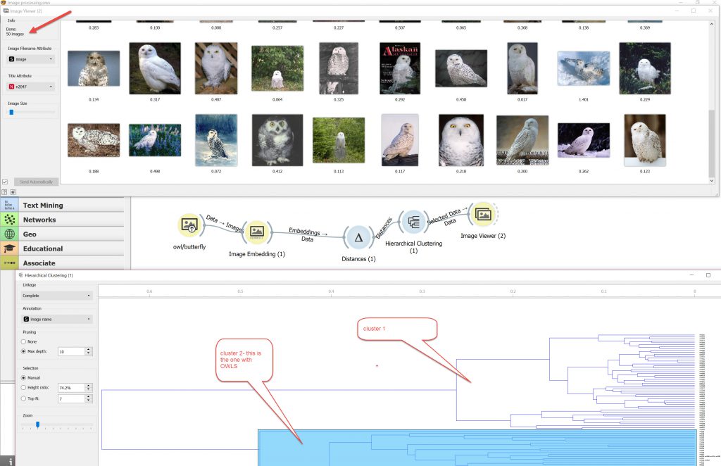 I quickly connected Orange up as per the Orange video on the process with the Weka Butterfly/owl dataset ( then tried the weka vehicle dataset too) and found that it correctly interpreted all the 100 images and put them into 2 clusters (see below). It was easy to set up , easy to use , and easy to check image output. By far the easiest process to use.