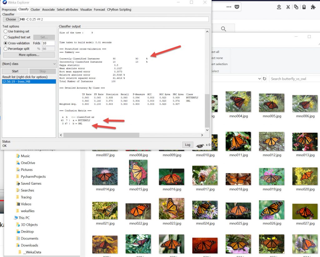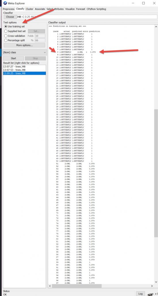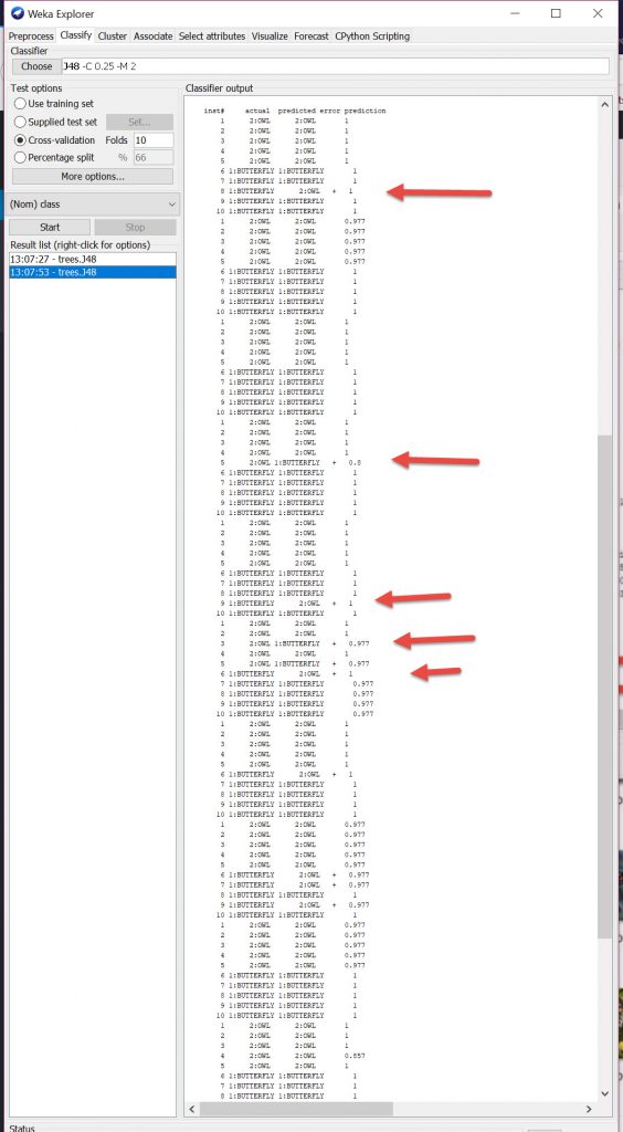 Using the display output predictions the results panel shows the wrongly predicted images, but since this is using 10 fold cross validation process it will take some time to identify which actual images were incorrectly interpreted.