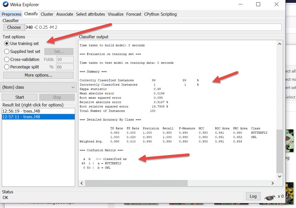 So resetting to Use Training Set instead of 10 fold cross validation the results are better. In fact, only one image was incorrectly identified, that of a butterrfly.