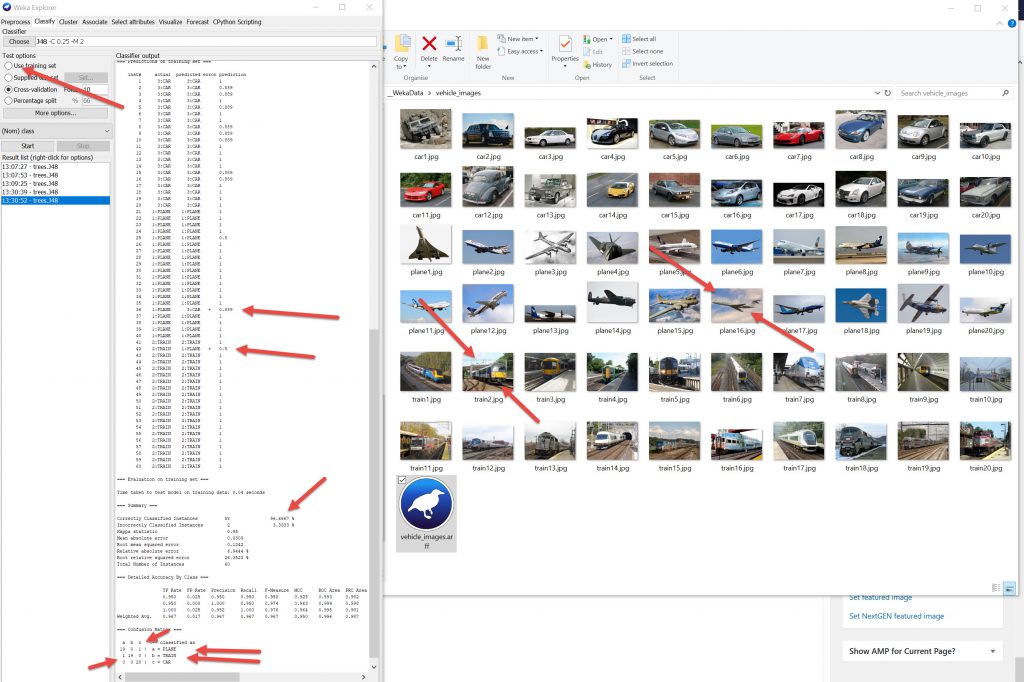 Using the Vehicles set which is split into 20 cars, 20 planes and 20 trains and using the TRAINING SET with J48 there is a 96.7% accuracy. Looking at the incorrectly assessed images Plane/Car (im 36) and Train/Plane (im 42) I cannot see why the pattern classification chose these as they seem pretty well middle of the road as to their class.