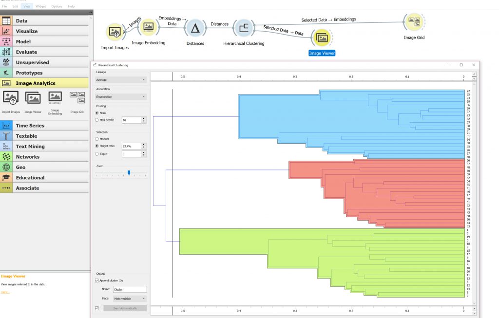 After looking through the processes that come with the add-in package there does not seem to be one for image clustering like the Orange package. I had a wee play with the RapidMiner Image processes but did not get too far with them. So like Knime. I explored and did not get very far. I’m not sure where I would use this particular image processing workflow.