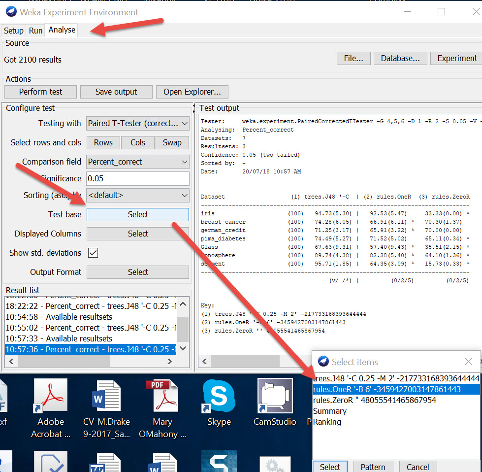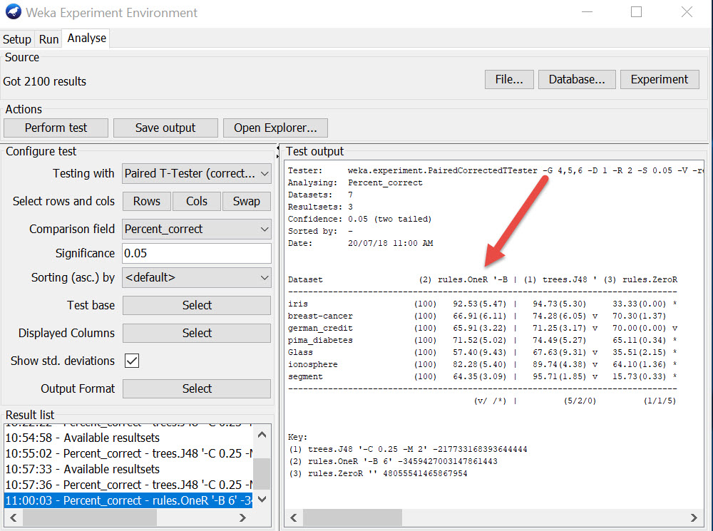 In the example above, the results are comparing the rules.ZeroR and rules.OneR against the trees.J48 algorithm. If we want to compare against the rules.OneR we can change the setup as below.