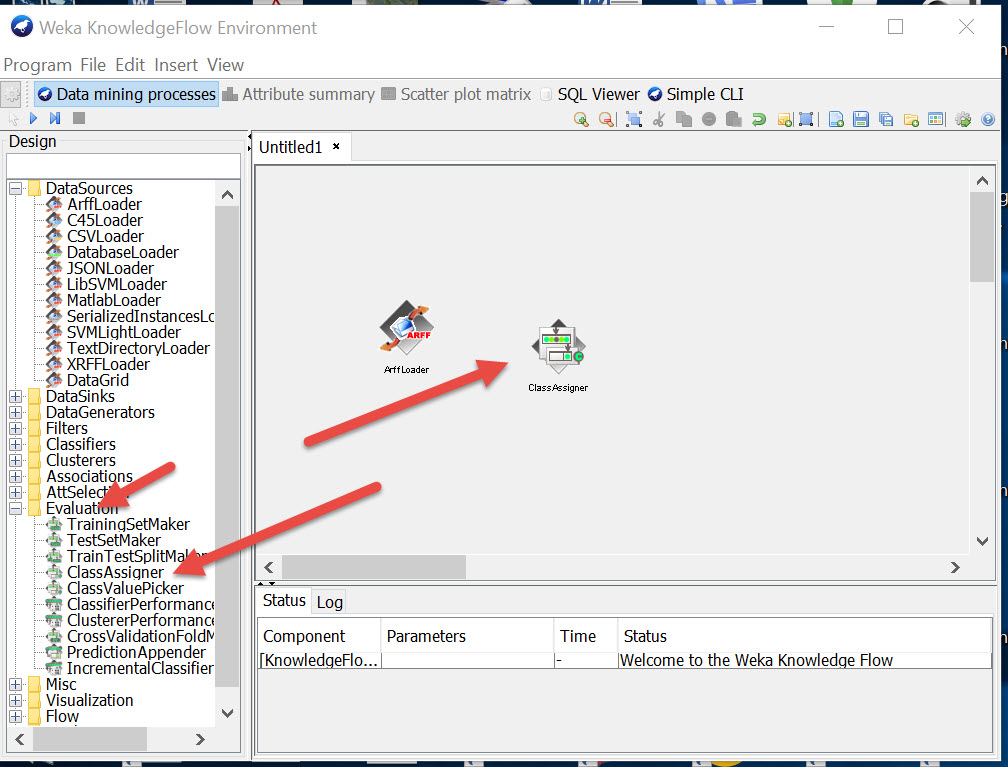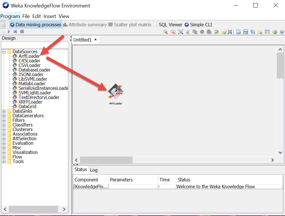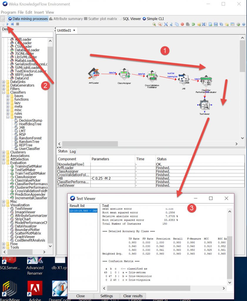 Create a workflow by connecting nodes together for 1/Dataset, 2/ Actions/Processes, 3/ output (Text visualiser/Graphics). Then hit the RUN icon and right click the Visualisers to show results in pop-up boxes.