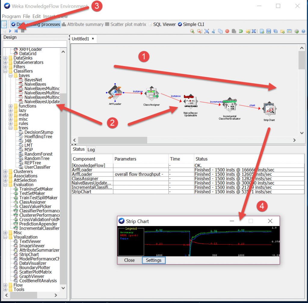 So whilst Weka seems to be a good analysis/testing tool I cannot see a practical way of turning its results into a workflow for implementing easily. I think I would try and reproduce using the algorithms in Knime to build something practical. There is the Knowledge Flow process but I prefer Knime as it is easier to build. So test in Weka, build in Knime would be my thoughts on implementing some Machine Learning Algorithms.