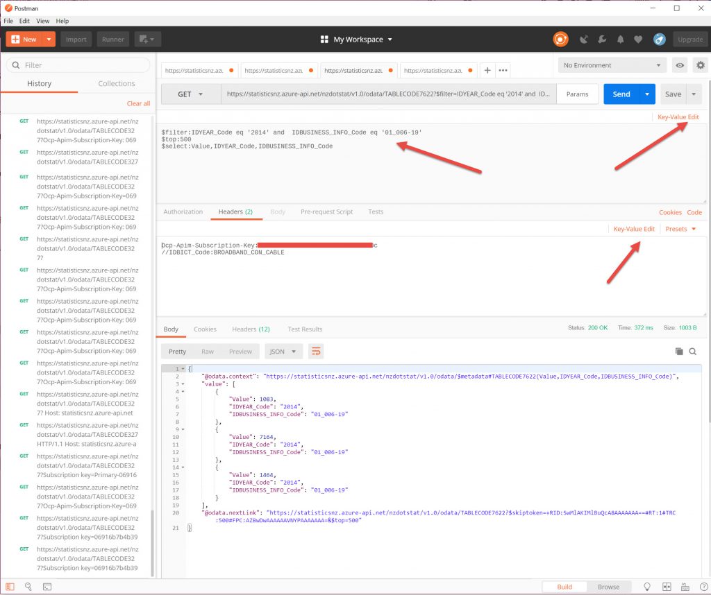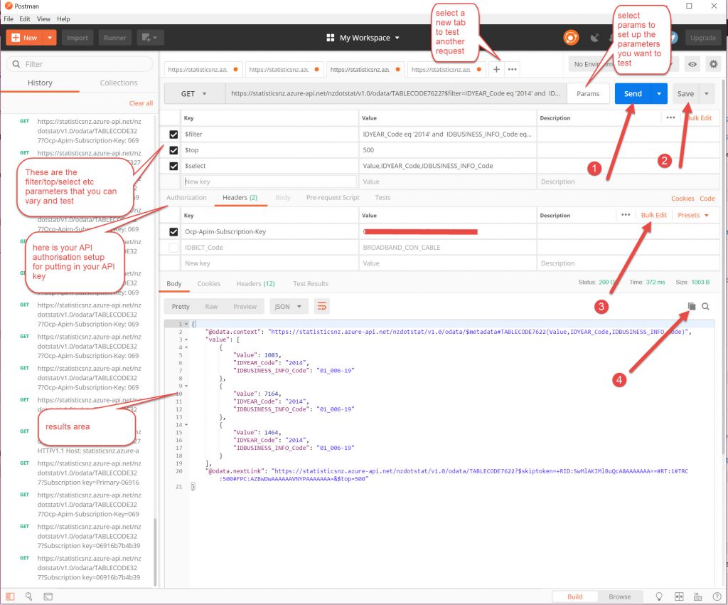 The nice thing about Postman is that it will work with a lot of different API’s not only the Stats.NZ one, and at least you are working with the same tool so can become familiar with the tool rather than a lot of different web sites.