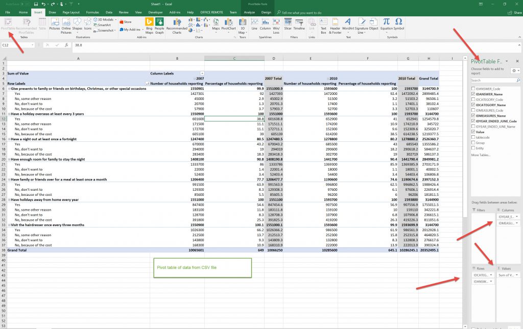 So we’ll use a Pivot Table to re-configure the data to display it in a similar format to the stats site. (I must note that I still haven’t got my head around Pivot Tables, I keep on meaning to write an article on it, but feel I’ve still got a lot of learning before I can do this, I just can’t seem to visualise it, although once displayed it makes sense, its visualizing the result from the raw data, I don’t seem to be able to make thew mental leap!):