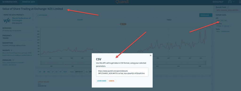 Using the Quandl free “Financial data” links as shown below on selection of free data (I think I used my free account to get the link) you can download a lot of data, in this case it is in CSV format already, which is handy.