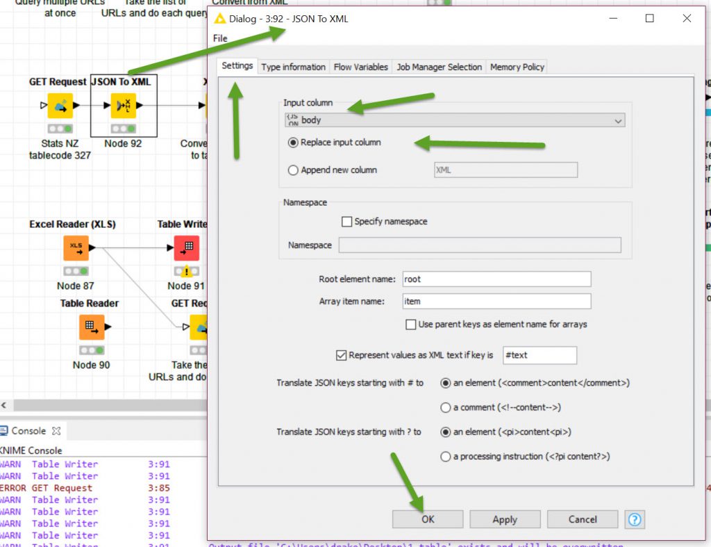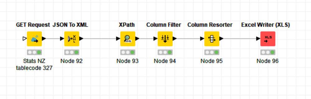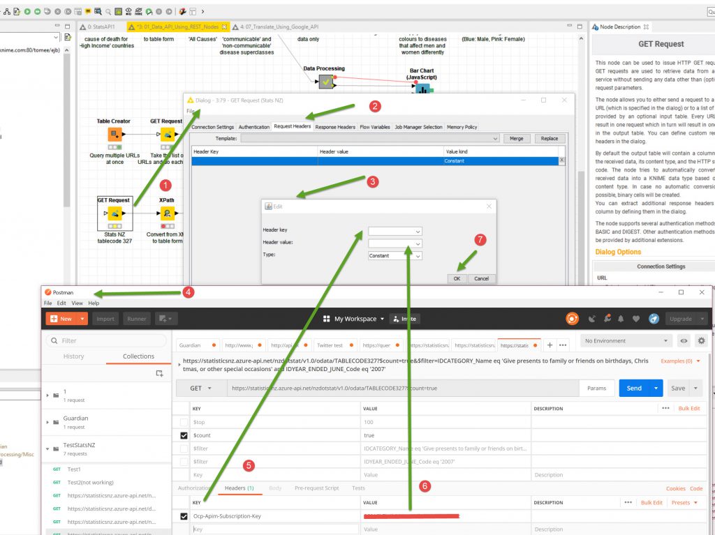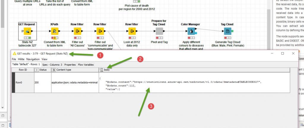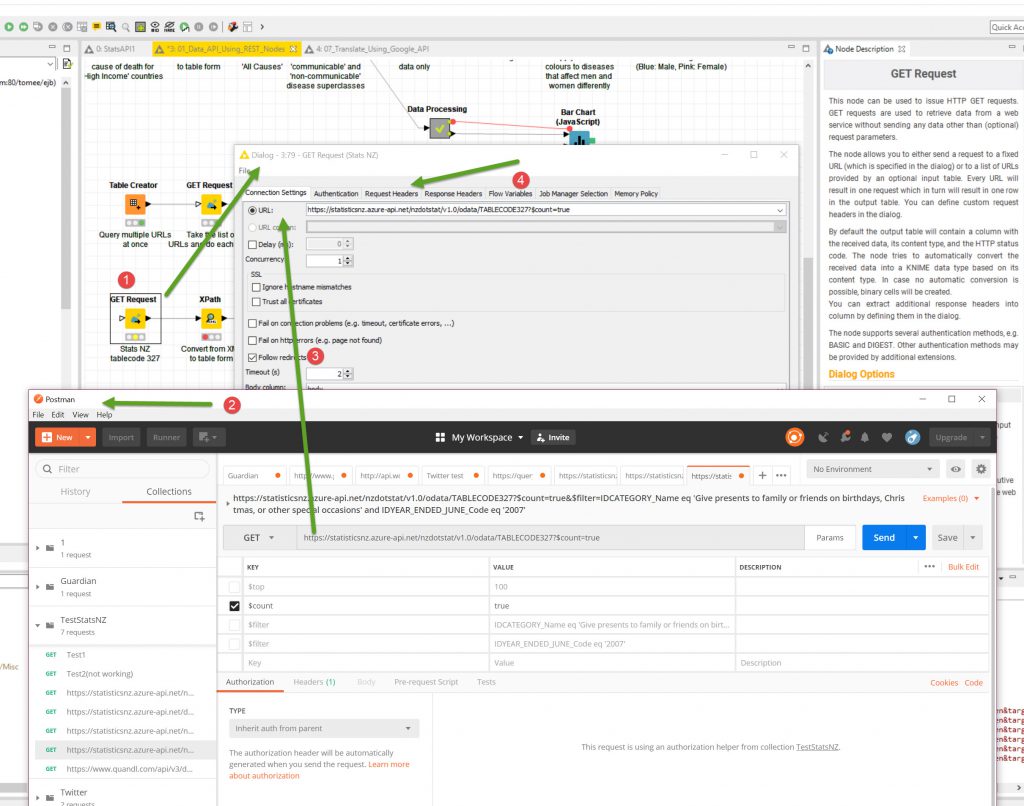 Then I will modify the single GET node to the Stats.NZ information. I will use the test information I used in Postman an copy it across to the Knime Node. Both the URL (with parameters).