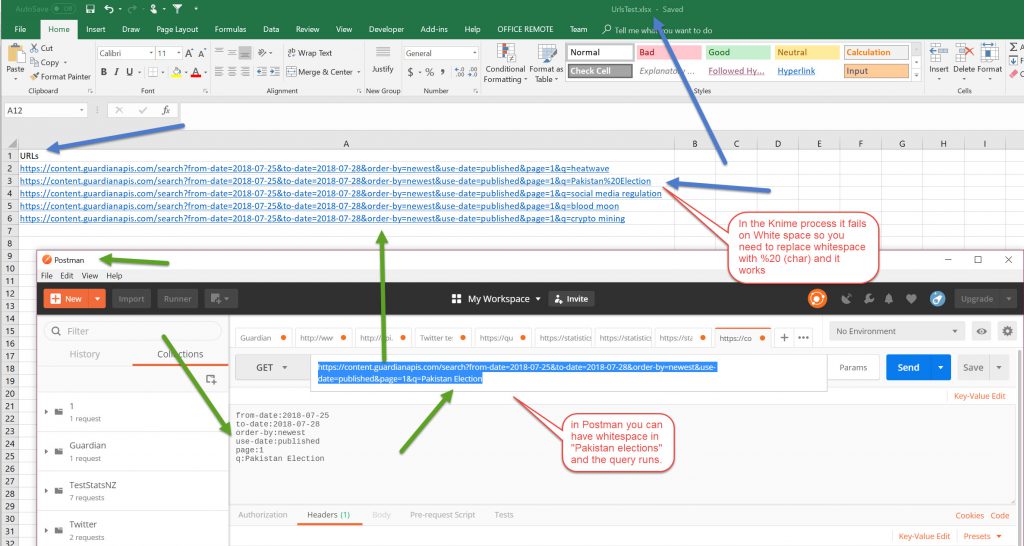 I have tested the Guardian Get requests in Postman and then cut/paste URL’s into an Excel Sheet.