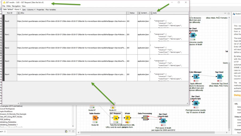 The Get Request Output table shows the JSON column data from each of the rows of URL requests.