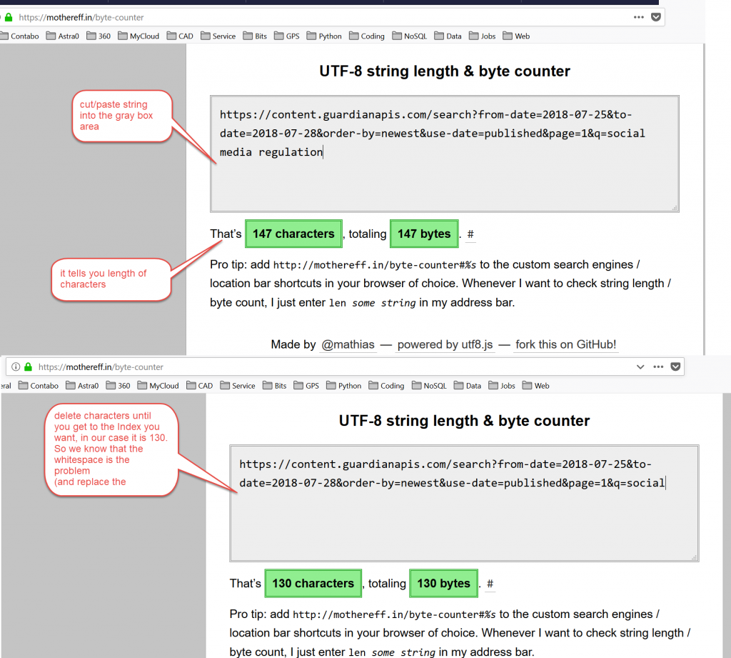 Anyway there were errors. The errors are shown in the console (items 10,11 & 12 in image below). Now it says illegal character at index 130. I hate counting up the characters to find index 130, so after doing this a few times I found this site for counting string lengths.
